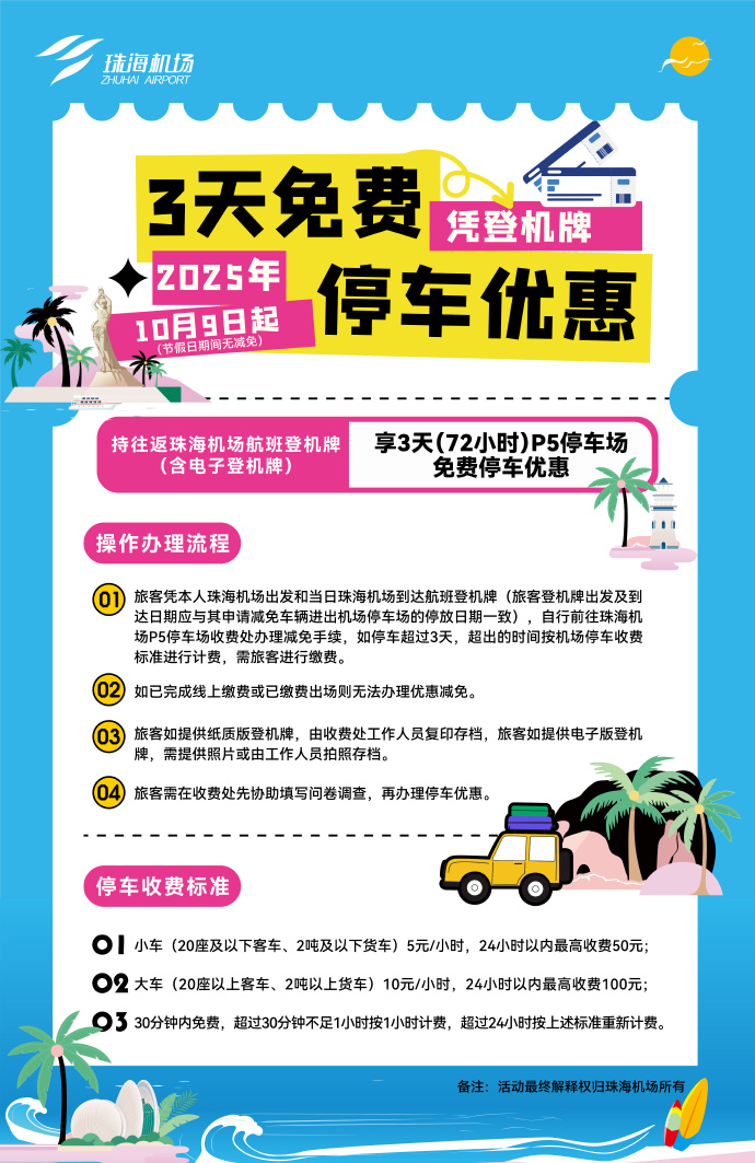 自2025年10月9日起(節(jié)假日期間無減免),旅客在此期間持往返珠海機場航班登機牌(含電子登機牌)可享受3天(72小時)P5停車場免費停車優(yōu)惠。