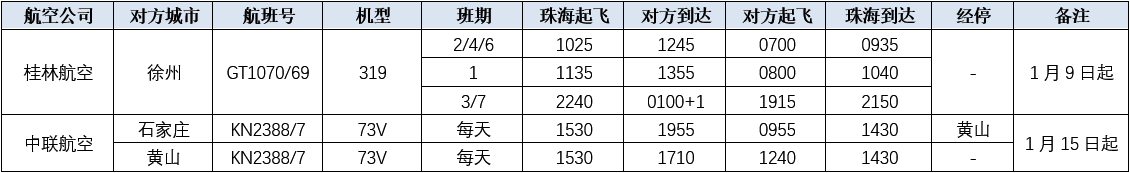 1月9日起,桂林航空新增加珠海=徐州 GT1070/69航班,每周6班(1/2/3/4/6/7);1月15日起,中聯航空現執行的珠海=石家莊 KN2386/5航班(每天1班)置換為珠海=黃山=石家莊 KN2388/7航班(每天1班)