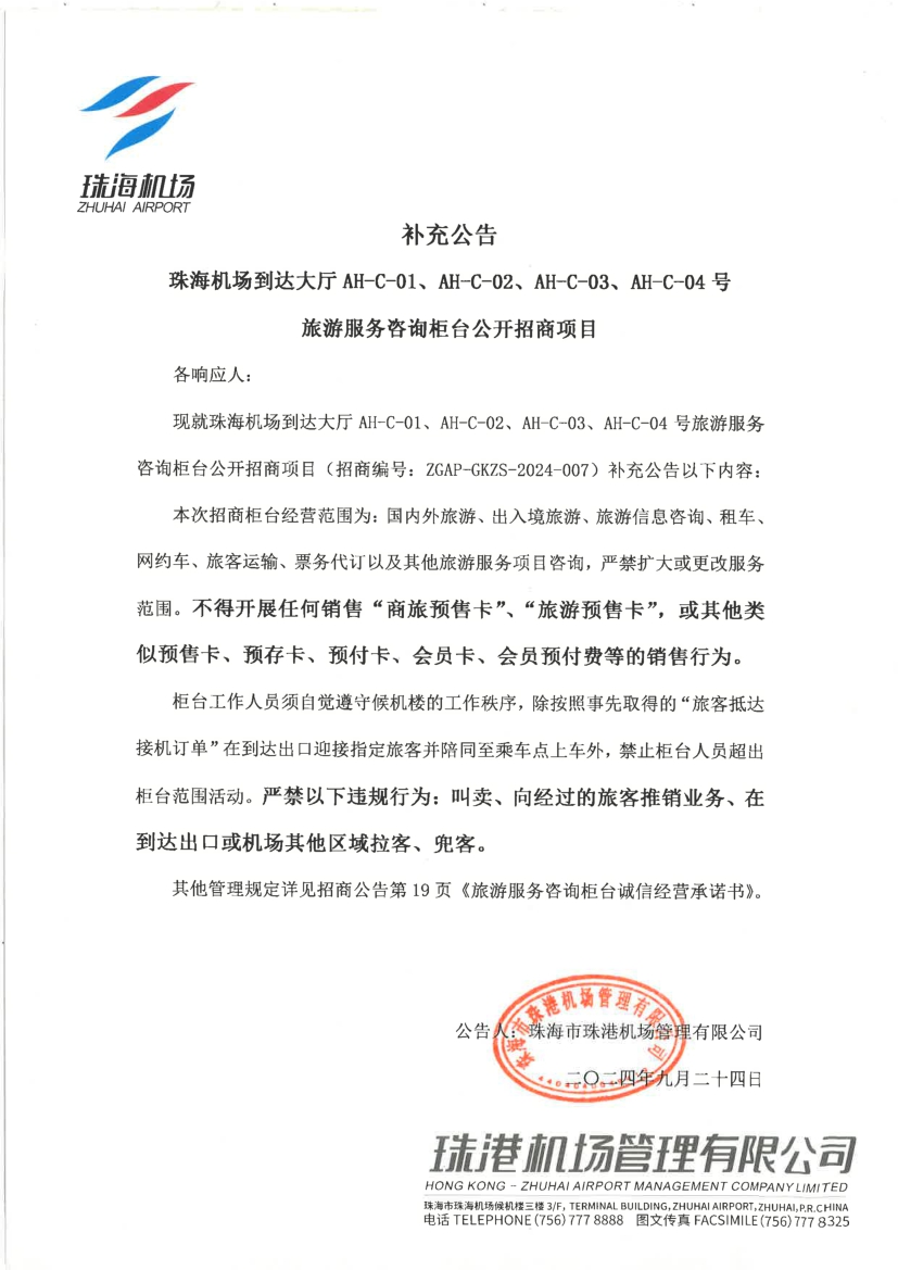《珠海機場到達大廳AH-C-01、AH-C-02、AH-C-03、AH-C-04號旅游服務咨詢柜臺公開招商項目》(招商編號:ZGAP-GKZS-2024-007)-補充公告