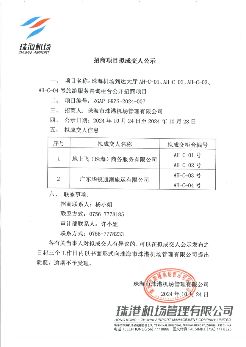 珠海機場到達大廳AH-C-01、AH-C-02、AH-C-03、AH-C-04號旅游服務咨詢柜臺公開招商項目擬成交人公示