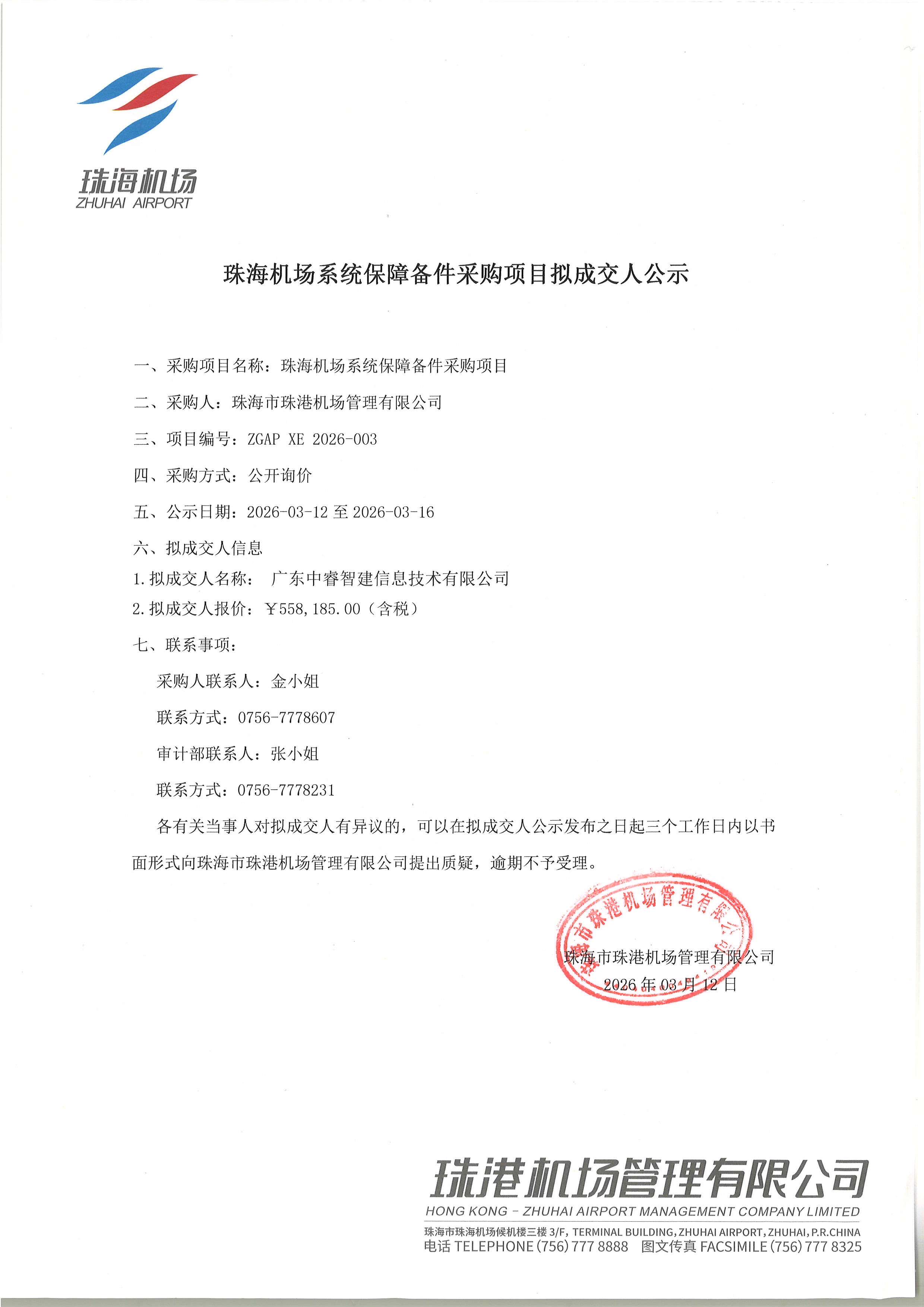 珠海機場系統保障備件采購項目擬成交人公示