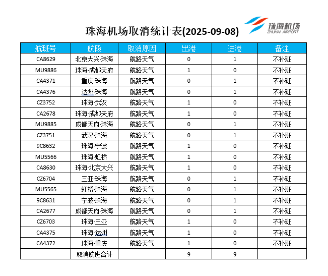 【航班取消信息】9月8日,珠海機場取消出港航班9班,進港航班9班,詳見下圖,請出行旅客及時留意航班信息,與所購票航空公司聯系,合理安排出行。
