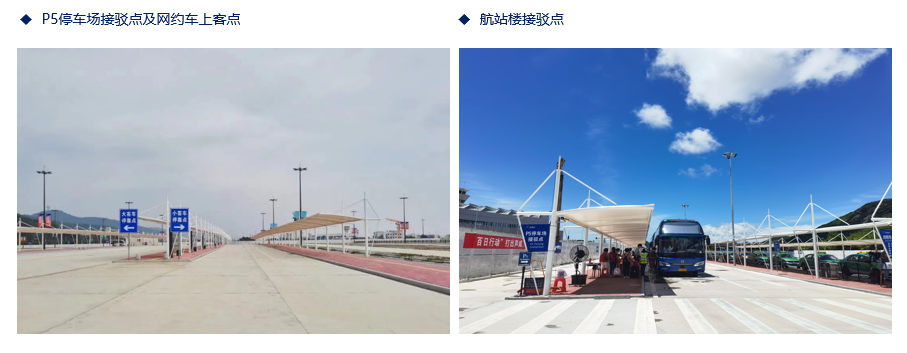 旅客可乘坐免費接駁車往返航站樓。需乘坐網約車的到港旅客,可前往航站樓到達出口前一樓上客區。