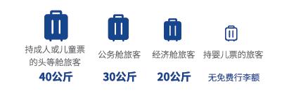 ?持成人或兒童客票的經濟艙旅客為20公斤,公務艙旅客為30公斤,頭等艙旅客為40公斤。持嬰兒票的旅客,無免費行李額。(各航空公司托運行李重量、尺寸規定有差異,請以所搭乘的航空公司要求為準。)
